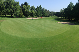 Par 4 muy similar al hoyo 9. Hoyo recto y sin excesivos problemas, salvo el fuera de límites de la parte derecha. El green recibe bien las bolas al tener dos pianos en sentido del juego. Mejor quedarse algo corto para no tener que patear de vuelta. Un gran bunker protege el green por la parte derecha y un roble por la parte izquierda.
